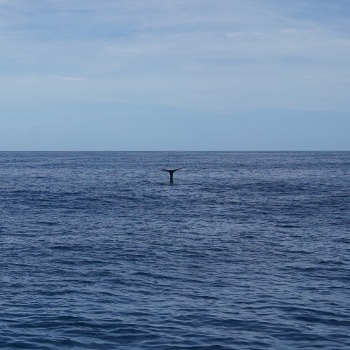 Une fois que celle ci a replongé, nous sommes très chanceux car on en voit une troisième un peu plus loin. Il suffit de changer de bord de bateau pour la voir. Elle est marrante la dernière parce qu’elle nous fait un petit coucou avec sa queue en faisant semblant de plonger, elle nous fait signe 5 à 6 fois avant de disparaitre au fond de l’eau.